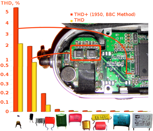 Multilayer ceramic capacitors produce a wide spectrum of harmonics up to the 13th, making the veil harshly audible. Electrolytic capacitors largely differ in terms of distortion. The worst are with polymer electrolyte membrane or tantalum anode. The best caps for audio are with the highest power density, made of graphene sheets, for example. Among massively produced electrolytes, Elma, Nichicon MUSE and Rubycon MBZ/MCZ sound quite good. Just to reiterate, electrolytic capacitor's audio fidelity is not directly related neither to a Q-factor, nor to ESR. It is primarily capacitor's ability to quickly and linearly transfer the energy from one end to another.